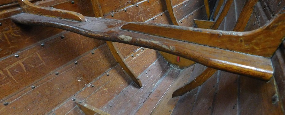 Sonstige Details: Das Boot ist zu großen Teilen original, es besitzt eine anscheinend originale Fussteueranlage!,  die dazu gehörenden Skulls sind aus Vollholz und mit hoher Wahrscheinlichkeit original, lediglich Steuersitz und Lehne fehlen,